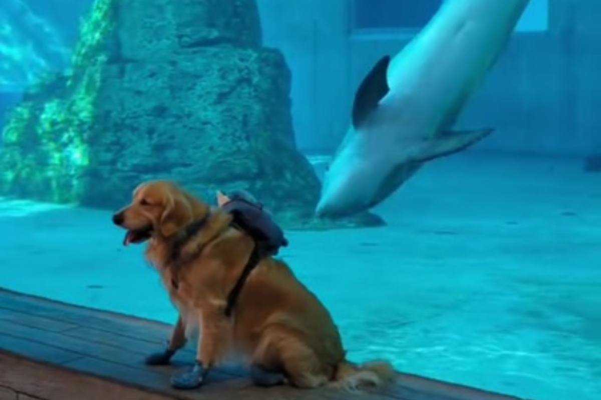 Pancake si è probabilmente distratto dal guardare i vari animali o qualcos’altro ha catturato la sua attenzione. Di fatto, si è messo di spalle ad una vasca e l’animale che c’era al suo interno lo ha notato. Questo era un delfino che ha visto il quattro zampe e ha deciso di avvicinarsi immediatamente.