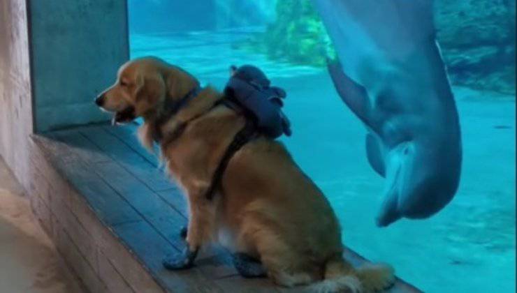 Questi due animali in natura è molto difficile che possano incontrarsi eppure è bastato uno sguardo per creare un’atmosfera serena e distesa. Forse sarebbero potuti andare d’accordo viste le premesse. I Golden Retriever hanno un carattere molto docile e i delfini sono estremamente intelligenti.