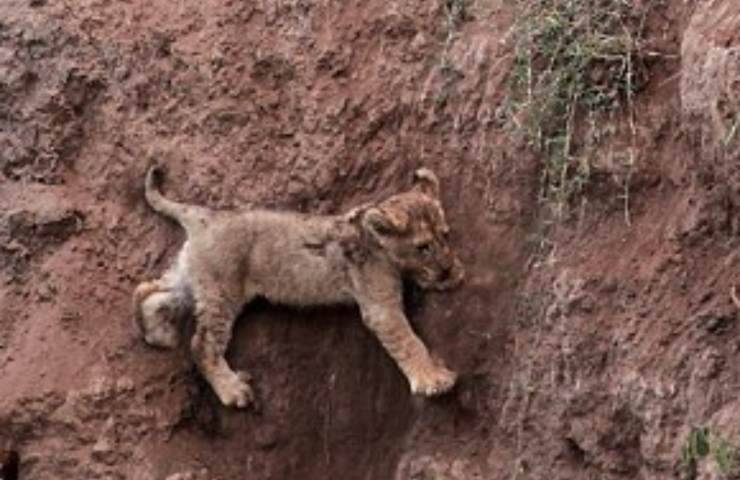 Qualche tempo fa il fotografo naturalista Jean-Francois Largot è stato testimone di un eroico salvataggio, che ha prontamente documentato; le sue foto hanno fatto conoscere a tutto il mondo una storia di audacia e affetto. L’uomo si è trovato ad assistere alla caduta in un burrone di un cucciolo di leone che giocava tranquillo. La mamma del piccolo, accortasi subito della gravità della situazione, ha chiesto aiuto al suo branco. Intanto aggrappato al lato della parete rocciosa, il leoncino invocava pietosamente l’intervento della mamma.