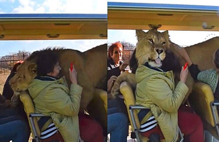 Un leone, durante un safari, è salito sull’auto con le persone a bordo: il video è incredibile e l’enorme felino è alla ricerca di coccole