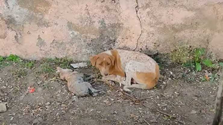I suoi occhi implorano aiuto: cane mamma disperata per il suo cucciolo che sta morendo