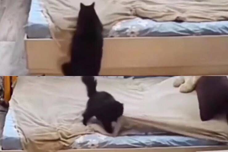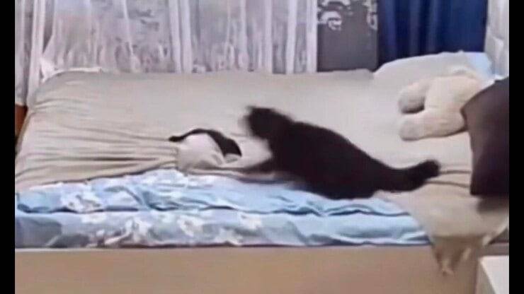 Un video incredibile quello che sta affascinando il mondo web. Le immagini mostrano come un gattino salta sul letto e giocando con la tanta energia che ha, mette in malo modo le coperte. Così arriva la mamma gatta, che con la zampetta sulla sua testolina lo fa indietreggiare portando il cucciolo a cadere dal letto.
