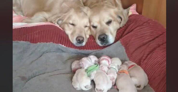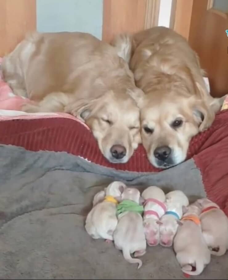 Questa coppia di genitori, una mamma e un papà Golden Retriever veglia sul sogno dei loro cuccioli appena nati. Le immagini sono meravigliose