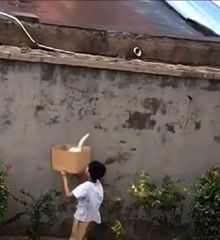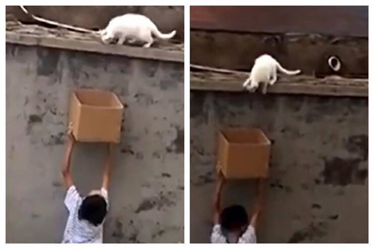 Ma il ragazzino non si da per vinto. Recupera di nuovo la scatola, e infondendo fiducia e quel pizzico di coraggio in più al micino, riesce a farlo saltare e così metterlo in salvo.