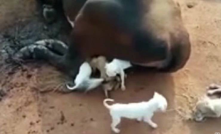 La mucca si prende cura dei cagnolini come fossero i suoi cuccioli: li allatta e li protegge – VIDEO