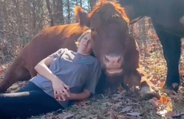 Una donna che ha peso un figlio in un incidente trova conforto negli abbracci di una sensibile mucca del santuario.