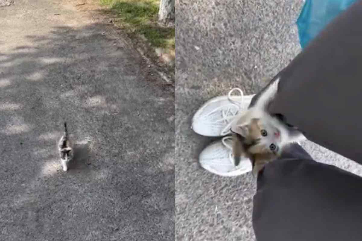 Il miagolio del gattino si percepisce sin da quando è ancora lontano dalla donna che accoglierà infine il suo arrivo lasciando al micio la possibilità di arrampicarsi sulle sue gambe. Il fatto che la donna indossi, in quel momento, un paio di sneakers non esclude che sia potuta uscire dalla sua abitazione, approfittando della bella giornata di sole, per svolgere dell’attività fisica. Da ora in poi – almeno si spera – la donna avrà un piccolo compagno di avventure con cui condividere le sue uscite fuori casa.