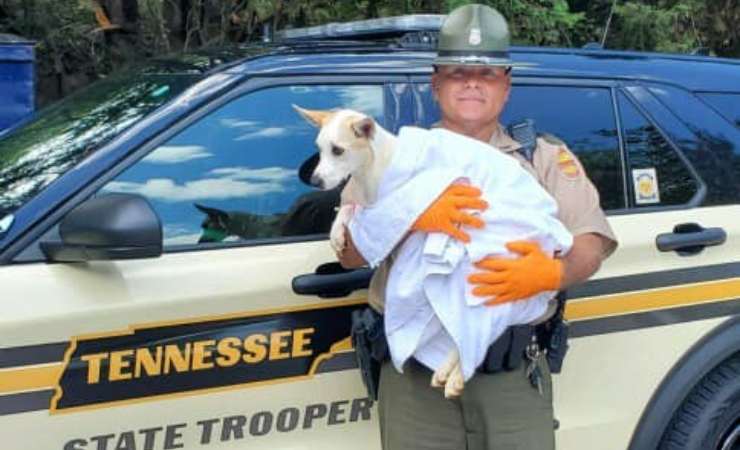 Un momento da eroe per un poliziotto della Tennessee Highway Patrol si è trasformato in un nuovo nucleo familiare, grazie a un ombrello, un cuore gentile e alcune merendine. Tutto è iniziato il 15 giugno, quando l’agente Clinton, soprannominato “Pumpy”, è stato fermato sulla Interstate 75 da una gentile signora, che gli ha segnalato un cane sul ciglio della statale che soffriva per il caldo estremo. L’agente ha indagato e ha trovato il cucciolo surriscaldato ed esausto che giaceva nell’erba vicino alla strada.