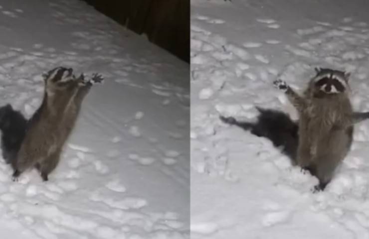 Passatempi invernali: il sorprendente video del procione che gioca con la neve che cade cercando di afferrarla con gli artigli