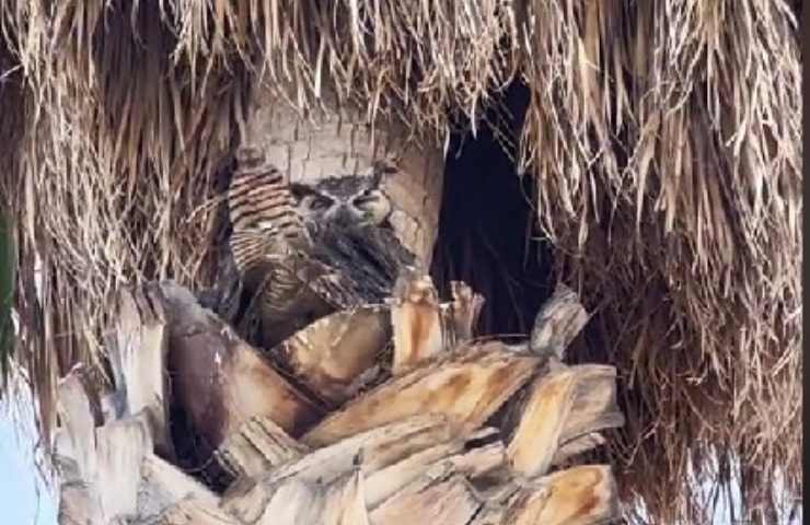 Da quello che l’esperta ha potuto vedere, le palme circostanti non avevano fornito uno spazio adeguato per la nidificazione o per le ramificazioni, quindi il piccolo gufo era probabilmente caduto dal suo albero e stava cercando un posto dove nascondersi. I piccoli di gufo in genere imparano a volare da terra ed è per questo che è frequente vederli camminare goffamente o volare contro i lati degli edifici. Durante questo periodo di difficoltà, è importante lasciare loro spazio e chiamare un esperto di fauna selvatica se si pensa che ci sia qualcosa che non va.