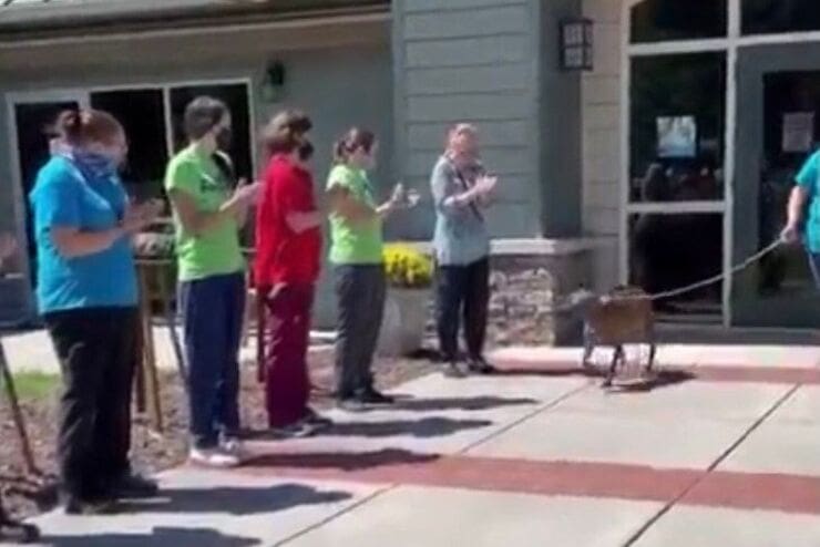 Tutti in fila battendo le mani, hanno ammirato sfilare Big Mac, con la sua nuova mamma umana, mentre lascia il rifugio e andare verso la sua nuova e meravigliosa vita.