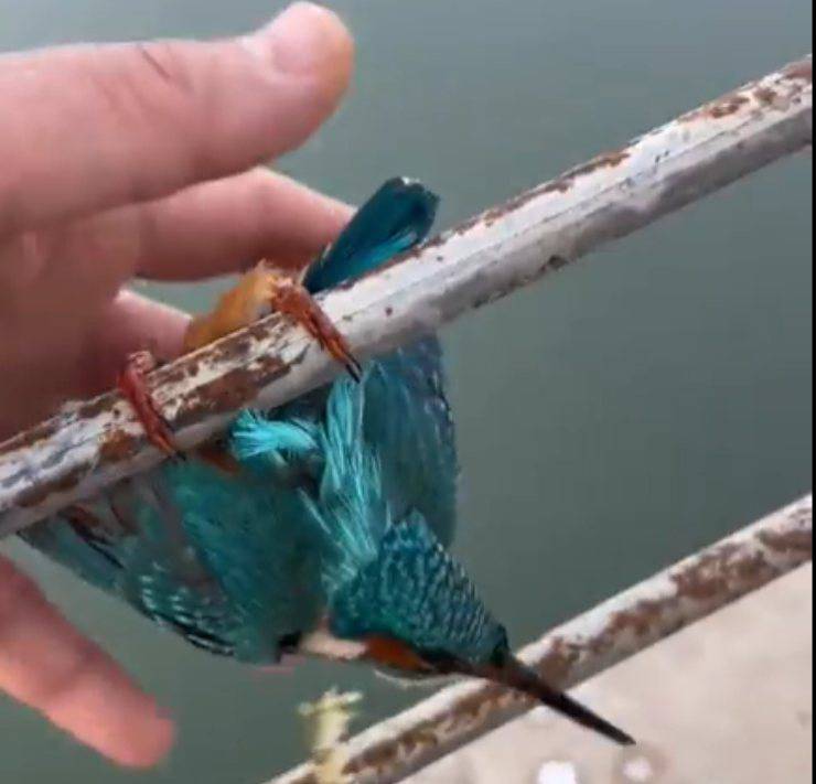 Uccellino rimane bloccato con le zampe alla ringhiera: un uomo interviene e lo scalda (VIDEO)