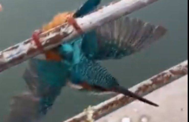 Come mostra infatti il video, un uomo sta camminando sulla sponda di un fiume innevato quando si rende conto della presenza di un uccellino in difficoltà. Il piccolo volatile, probabilmente un colibrì a giudicare dalla forma del becco, è rimasto bloccato a causa del freddo: le sue zampette, infatti, sono rimaste incollate alla sbarra di ferro della ringhiera posta a delimitare la sponda del fiume. Le zampe congelate per il freddo hanno reso impossibile al piccolo uccellino di spiccare il volo.