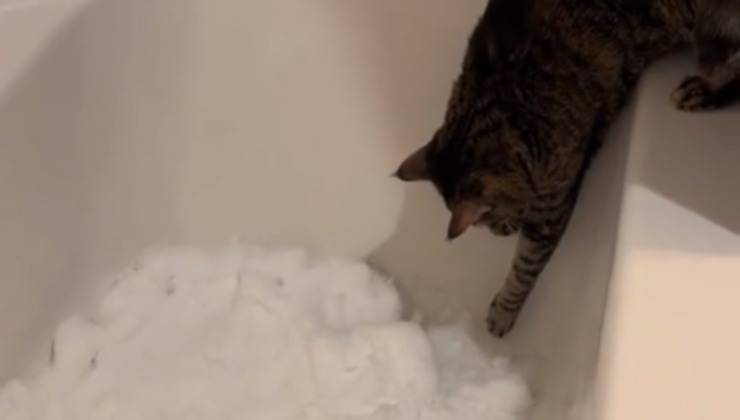 Perciò quando la nevicata è stata abbondante, con un raccoglitore ha preso la neve fresca e l’ha portata dentro casa, precisamente all’interno della vasca da bagno. Una volta pronto il letto di neve, ha avvicinato le sue due gatte alla vasca e ha immortalato la loro reazione, perché era la prima volta che vedevano la neve.