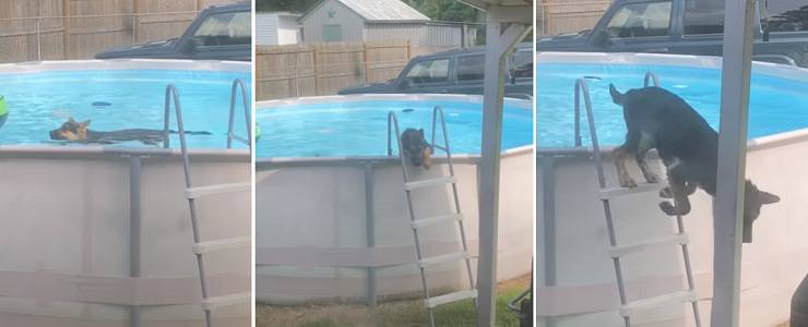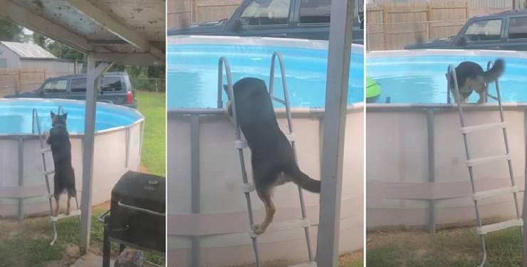 Un cane impara a tuffarsi in piscina quando ha caldo. Le riprese del cucciolo di pastore tedesco mostrano tutta la sua intelligenza.
