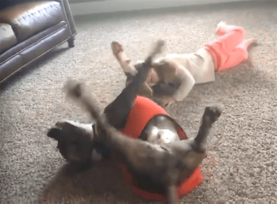 Le immagini mostrano sua figlia, una bambina di nome Kailyn, che fa la ruota davanti al pitbull di famiglia, che ha 18 mesi. Vestito con un maglione rosso, il cane può essere visto osservare Kailyn che esegue una serie di eleganti ruote. A un certo punto, decide di imitarla e inizia a rotolare sul pavimento. L’esilarante reazione del cane non poteva non stupire gli utenti della Rete. E se qualcuno pensasse a un caso o a un colpo di fortuna si deve ricredere: il pitbull ha poi rifatto la ruota.