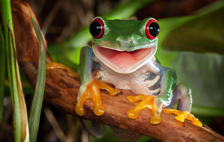 La raganella dagli occhi rossi rientra tra gli animali con gli occhi più grandi e teneri con un caratteristico colore rosso intenso.