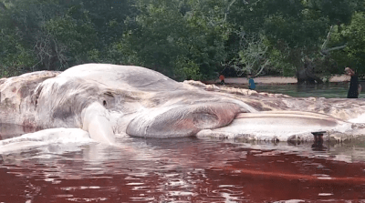 Il corpo dell’animale arenato lungo la spiaggia ha colorato di sangue l’acqua attorno a sé, come emerge dal filmato condiviso in rete e ripreso da numerosi giornali esteri.