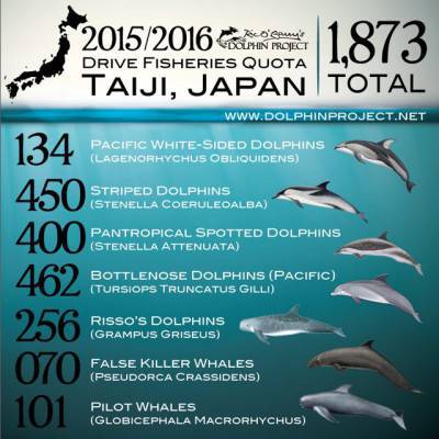 L’associazione di Richard o’Barry, annunciando la campagna per la stagione 2016/2017 ha comunicato anche i numeri funesti della caccia tra il 2015/2016, suddividendo le specie. Tra gli esemplari catturati anche Angel, il delfino albino Tursiope, trasferito al Museo marino di Taiji.