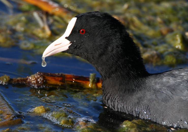 Caratterizzata dal colore nero uniforme, su cui si staglia una placca bianca della fronte. Il becco è bianco e gli occhi di un rosso chiaro. E’ abile nei tuffi, che le servono anche per la sua sopravvivenza: infatti si nutre anche di crostacei, oltre a insetti vari e vegetazione. Si muove spesso in branchi piuttosto numerosi. I piccoli sono indipendenti fin dai primi giorni e vengono nutriti dai genitori con pezzi di alghe. Quando vola prende velocità prima camminando sull’acqua.