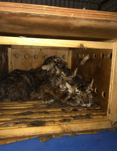 Le condizioni dei cuccioli erano buone nonostante il fatto che i tre cuccioli appartenenti ad una specie in via d’estinzione non avessero mangiato per giorni. La scatola era piena d’urine ed escrementi e al suo interno c’erano centinaia di vermi.