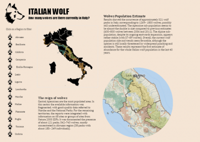 Recentemente è stato condotto uno studio dal Sole24ore, pubblicato nel dicembre del 2017, per delineare una geografia del lupo in Italia. I dati raccolti si sono basati sul database geografico dell’IUCN e lo studio “One, no one, or one hundred thousand: how many wolves are there currently in Italy?” di Marco Galaverni, Romolo Caniglia, Elena Fabbri, Pietro Milanesi, Ettore Randi (pubblicato nel 2015).