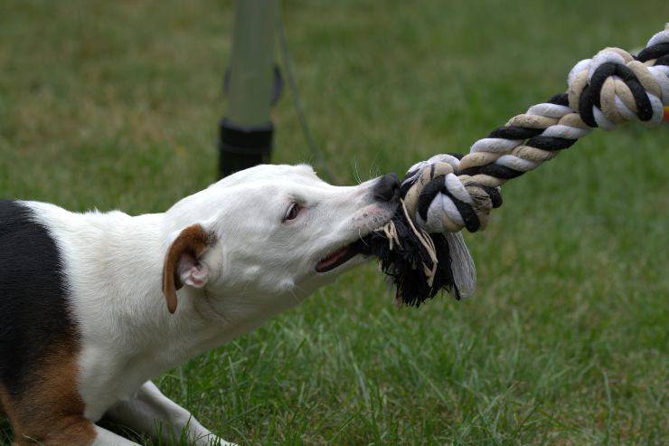 Durante un gioco, il peloso domestico può approfittare per esprimere quel suo carattere predatorio che fa parte della sua natura, esternando la sua forza e il suo potere di difesa attraverso i morsi su mani e piedi; inoltre, il cane morde gli oggetti, come una corda, per usare la sua mascella.