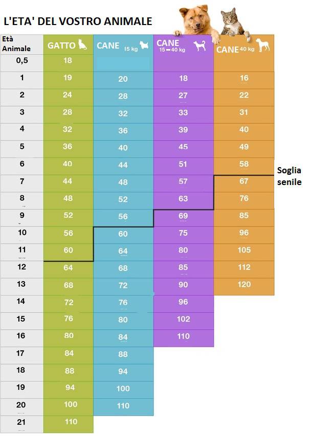 Per farlo viene utilizzata una tabella che varia in funzione al peso dell’animale. Ovvero, se un cane è di grossa taglia ha meno speranza di vita, per cui la tabella considera anche questi fattori.