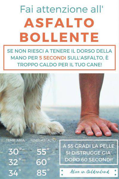 La temperatura dell’asfalto sotto il sole raggiunge livelli davvero elevati; arriva a 51 gradi quando all’esterno la temperatura è di 25 gradi; arriva a 57 gradi con 30 gradi all’esterno, e addirittura a 71 gradi con 31 gradi nell’aria!! Basta pensare a quanto spesso vengono raggiunti e superati i 30 gradi durante i mesi estivi più caldi, e questo dovrebbe darci il campanello d’allarme per i nostri cuccioli. A 55 gradi un uovo può friggere in soli 5 minuti; figuriamoci quanto può soffrire il cane.