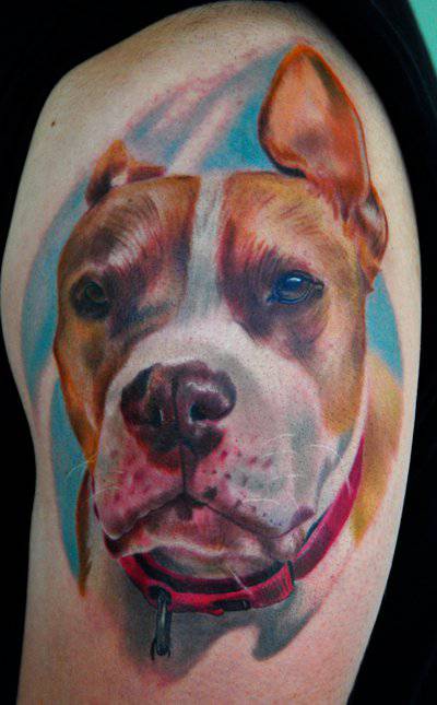 Anche in questo caso si tratta di un ritratto del cane, a colori e in stile realistico. Come per il polpaccio, la posizione sulla spalla permette di realizzare disegni di grandi dimensioni.