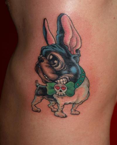 Passiamo alla serie delle rappresentazioni più stilizzate come questo delizioso tatuaggio a colori che sfrutta il linguaggio del fumetto con il quale apprezzare tutta la simpatia dei 4zampe.