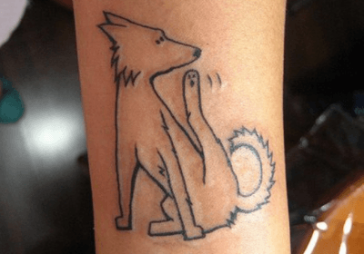 Anche in questo caso, il disegno è stilizzato e riprende la sagoma di un cane che si gratta. Il tatuaggio vuole sottolineare un modo di essere naturale e spontaneo dell’animale.