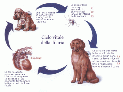 - La filariosi è una malattia che viene trasmessa dalla zanzara tigre parassitata a sua volta dal nematode Dirofilaria immitis di tipo cardiopolmonare oppure dal Dirofilaria repens di tipo cutaneo. Le larve del parassita Dirofilaria immitis entrano nel sistema circolatorio e, una volta diventati vermi adulti (lunghi anche 15 cm), si insediano nelle vicinanze di cuore e polmoni, provocando disturbi cardiaci e respiratori. I vermi crescono talmente in fretta da invadere completamente il cuore e portare a morte del paziente. I vermi adulti delle larve di Dirofilaria Repens, invece vanno a localizzarsi nella parte sottocutanea dell’animale.