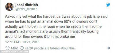 “Ho chiesto al mio veterinario quale reputa essere la parte più dura del suo lavoro e mi ha risposto che è quando deve praticare l’eutanasia, ma i padroni nel 90% dei casi decidono di non assistere. Gli ultimi momenti degli animali in questo caso consistono nel guardarsi intorno cercando il proprio padrone e questo mi uccide”.