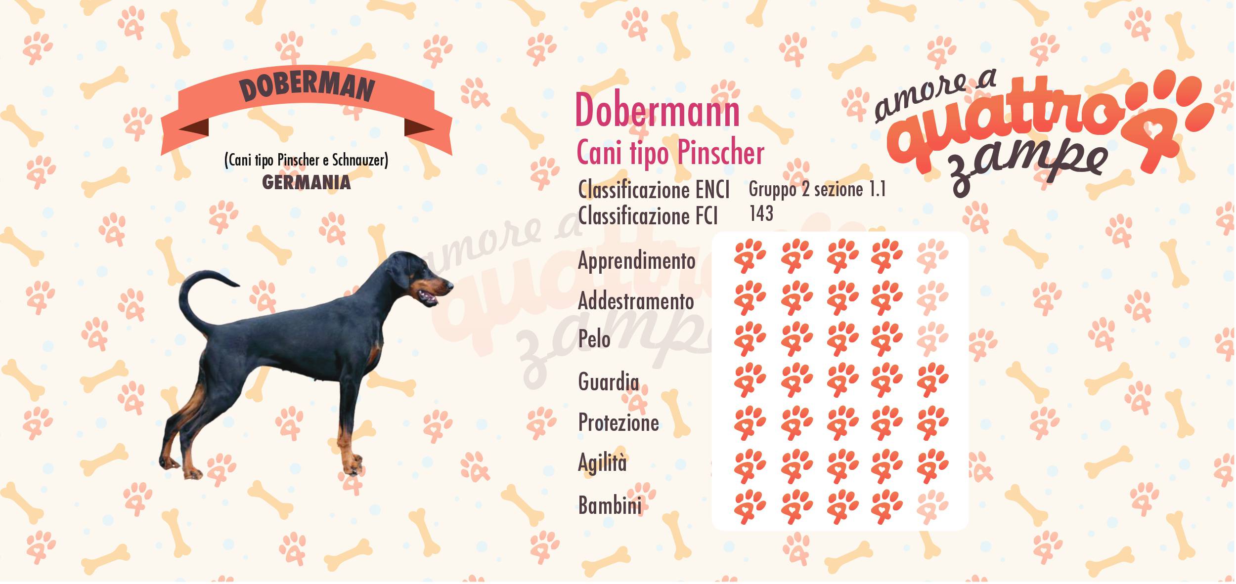Il Dobermann ha origini tedesche, è un amante del lavoro e molto sicuro di sè. Ama il suo padrone, che deve saperlo educare fin da cucciolo e addestrarlo costantemente.