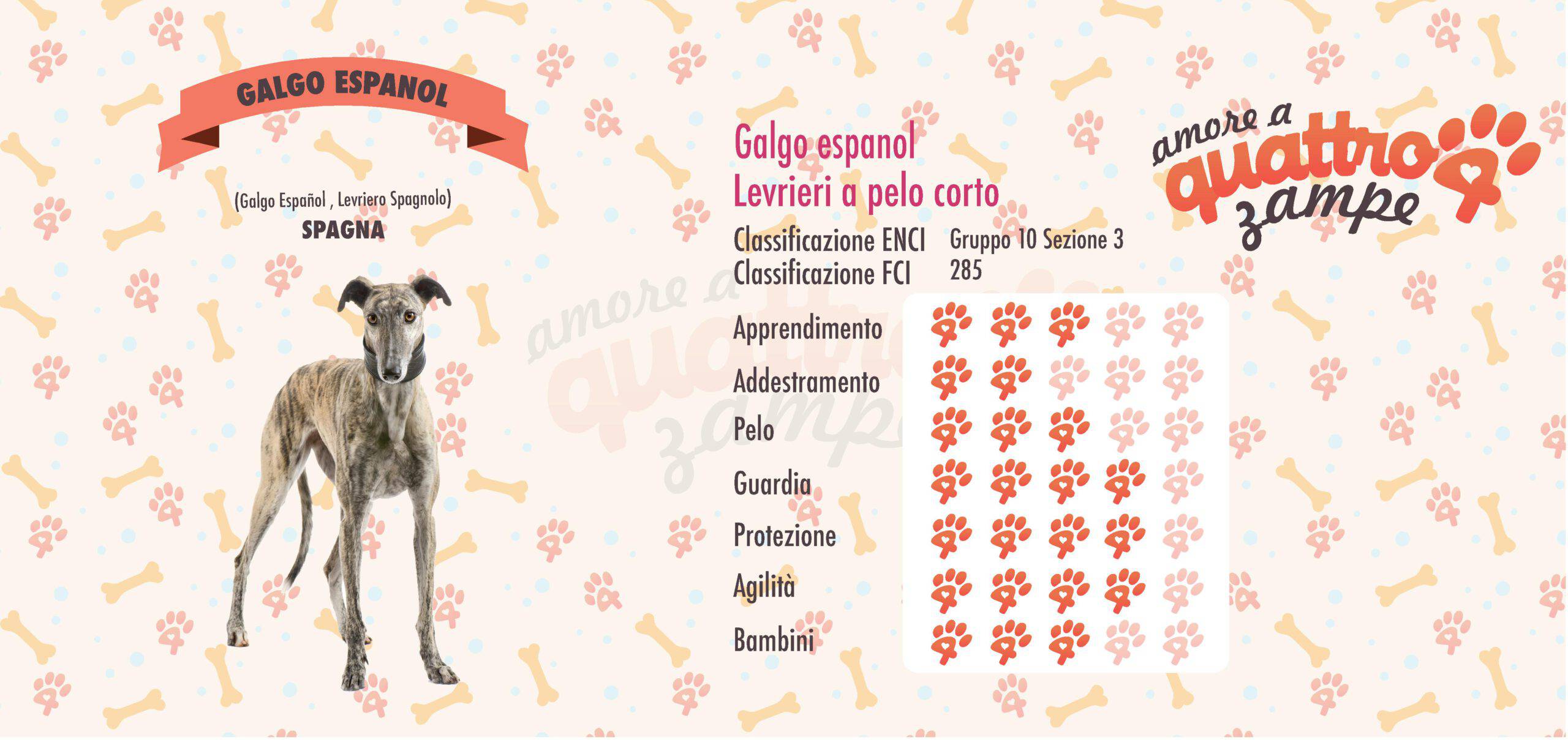 Per quest’esemplare spagnolo, c’è anche un proverbio ‘La lepre non sfugge al Galgos del re’. Questo risale ai primi anni del XIX Secolo. Nato come cane da caccia e nel tempo non ha subito cambiamenti, anzi è stato sfruttato per gare clandestine. Molto apprezzato come cane, il Galgo è amorevole, dolce, caloroso e non aggressivo. Apprezza le sessioni di gioco che stimolano i sensi olfattivi. Di dimensioni extra large, non risulta un cane che impaurisce, anzi è molto tenero nella sua grandezza. Molto energico quando lavora, infatti bisogna stare attenti se per le strade della città vede una preda, perché può essere pericoloso. Non è difficile da gestire ed educarlo, se vengono assecondate le sue richieste. Viene usato per la caccia alla lepre, ma anche per altri tipi di prede quali la volpe, il coniglio e il cinghiale. In Spagna, era allevato esclusivamente per la caccia, ma quando è stata proibita, questi esemplari hanno spesso subito maltrattamenti e abbandoni. Molte sono le associazioni che lottano per salvarli. Dall’aspetto gigante è molto energico e veloce, sa essere affettuoso, nonostante la sua reputazione di cane distante.