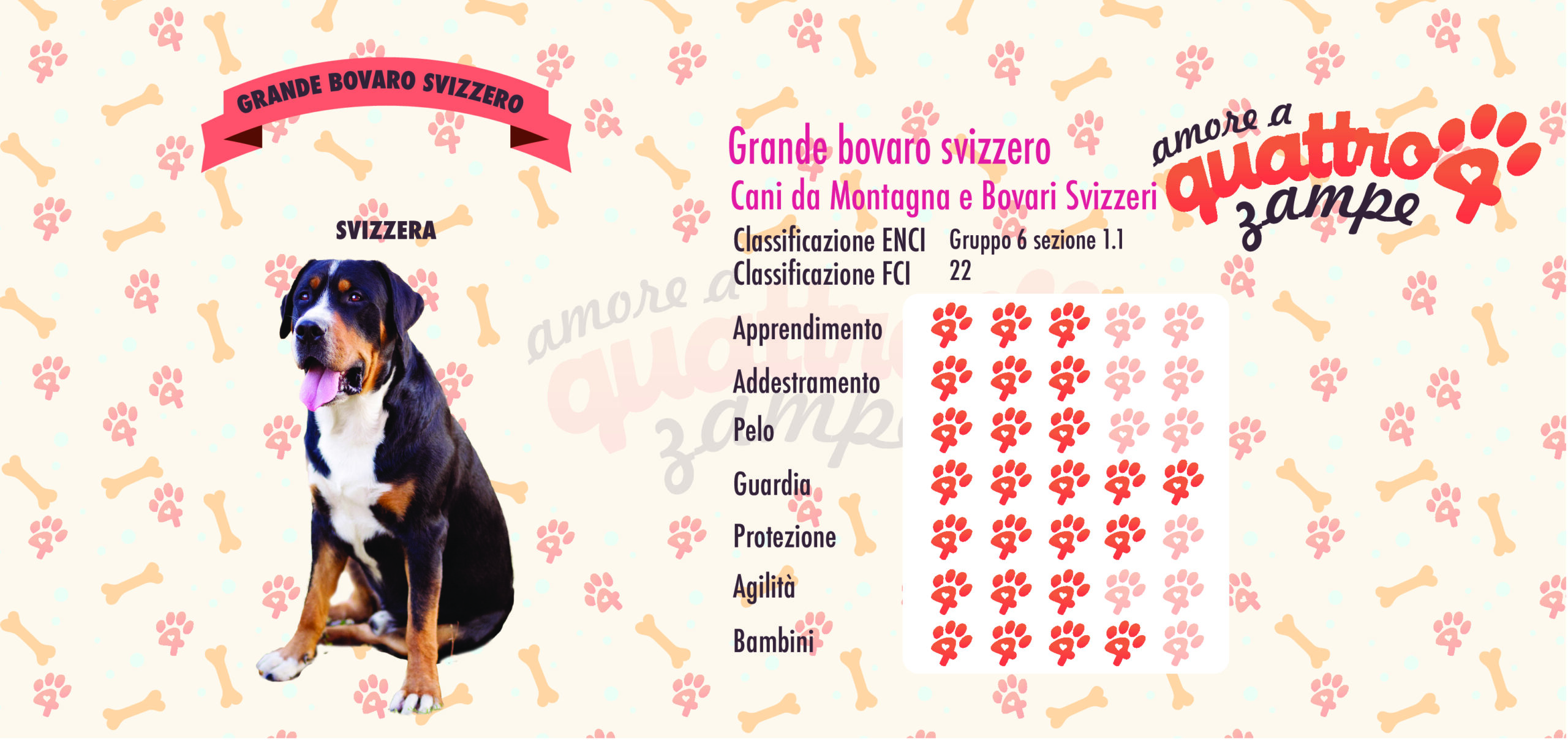 Il Grande Bovaro Svizzero chiamato anche Grosser Schweizer Sennenhund è un cane di taglia grande, molto possente, muscoloso e dall’aspetto fiero sella sua stazza. E’ perfetto come cane da guardia, è sempre stato usato in particolare per le greggi e le proprietà. Ha un carattere allegro, affettuoso spesso testardo e tenace. Molto protettivo con i bambini e verso la famiglia. E’ un buon cane da pet-terapy. Osserva ogni minimo dettaglio che lo circonda e questo lo porta ad avere un ottima memoria. E’ un cane obbediente, risponde a qualsiasi richiamo, ma gli ordini devono essere dati nel modo giusto senza aggressività, ma nemmeno con troppa debolezza. E’ perfetto come cane da compagnia, oltre ad essere un eccellente guardiano.