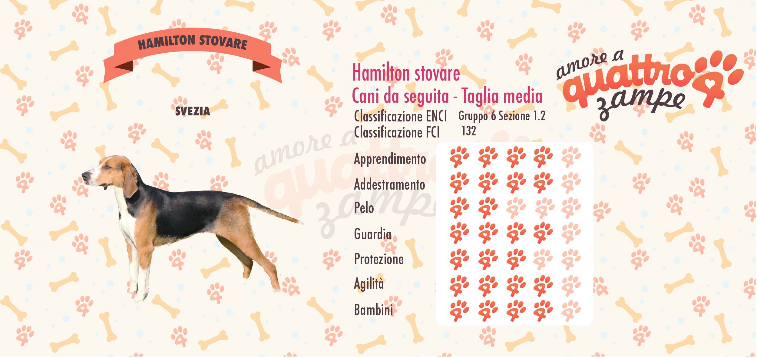 L’Hamiltonstovare o segugio svedese è un segugio che preferisce lavorare solo e non in muta. La sua capacità è quella di prendere la selvaggina di media o grande dimensioni come: la lepre, la volpe o il cervo. Dall’aspetto robusto, possente e con buon proporzioni è perfetto come cane da lavoro. Può essere anche un ottimo compagno per le giornata quotidiane, ma se non lavora si deve tenere in continuo movimento. Molto intelligente, affettuoso, determinato, amabile e risoluto. Non si hanno difficoltà nell’addestrarlo essendo docile e tranquillo, perché sa ascoltare i comandi del padrone. Riesce a sopportare la solitudine, ma l’assenza del padrone non deve essere molto prolungata. Può cacciare su qualsiasi terreno da quello roccioso e paludoso a quello piano e pieno di neve. Ama stare all’aperto e giocare con i suoi simili, ma anche con i bambini.