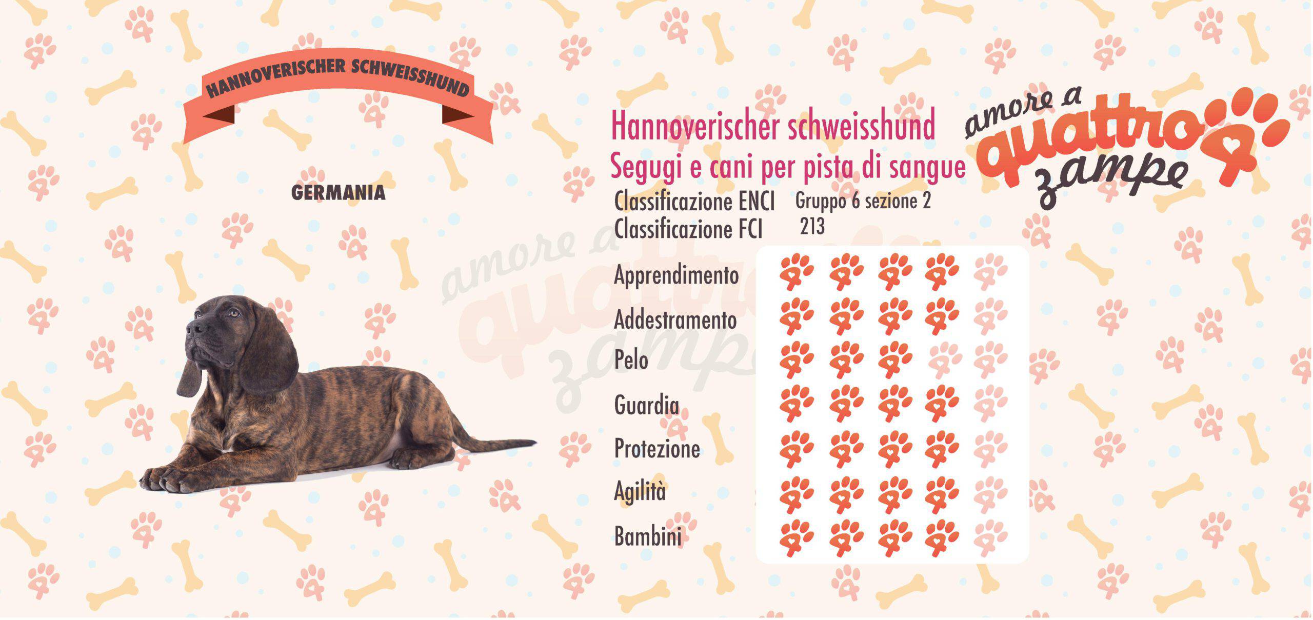 Il Segugio di Hannover chiamato anche L’Hannoverscher Schweisshund è di origine tedesca. Risulta massiccio, muscoloso ma con un viso grazioso e dolce. Ha un carattere abbastanza testardo nel lavoro ma è ubbidiente con il padrone e ama la famiglia. Giocare con i bambini è il suo spasso, a patto che lo rispettino. Non è consigliabile come cane da compagnia, può fare da guardia, ma la sua mansione in cui eccelle è la caccia. Sempre stato usato come guardacaccia per trovare animali feriti. In realtà riesce anche a seguire una pista vecchia e trova con facilità la preda selvatica. I cacciatori lo adorano per il suo olfatto. È un amico a quattro zampe molto intelligente e equilibrato. Nato come cane da lavoro e mettete tutto il suo impegno per portare a termine il suo impegno affidatogli dal padrone. E’ facile da addestrare ma non si adatta con facilità a qualsiasi stile di vita, anzi è consigliabile farlo stare in campagna all’aperto con i suoi simili. Esplorare la natura con lui e i suoi sensi superiori è un’esperienza e speciale.