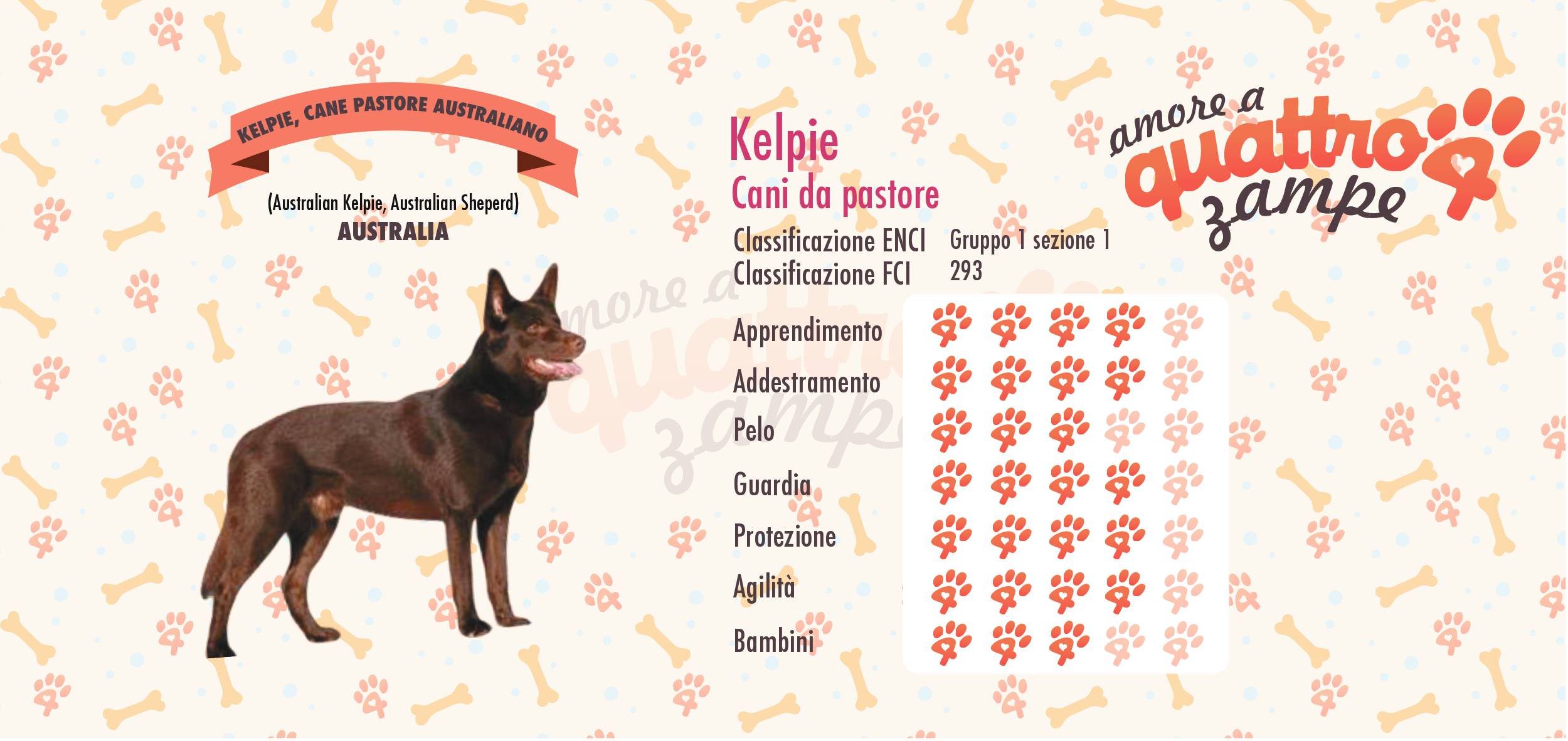 Il Kelpie è un cane da pastore australiano, razza riconosciuta dalla FCI. Discende dai cani da pastore che arrivarono in Australia poco dopo la metà dell’800 assieme ai coloni inglesi. Deriva da un probabile accoppiamento con il locale Dingo. Fu selezionato per radunare le greggi di Merinos e venne importata in Inghilterra. La prima apparizione del cane da pastore australiano risale al 1908. I cani da pastore australiani, assai noti nei loro paesi, ma sconosciuti nel resto del mondo, sono tre: il Cane da Pastore Australiano (kelpie), il Pastore australiano (australian shepherd) e l’Australian Cattle Dog, che è classificato tra i bovari.