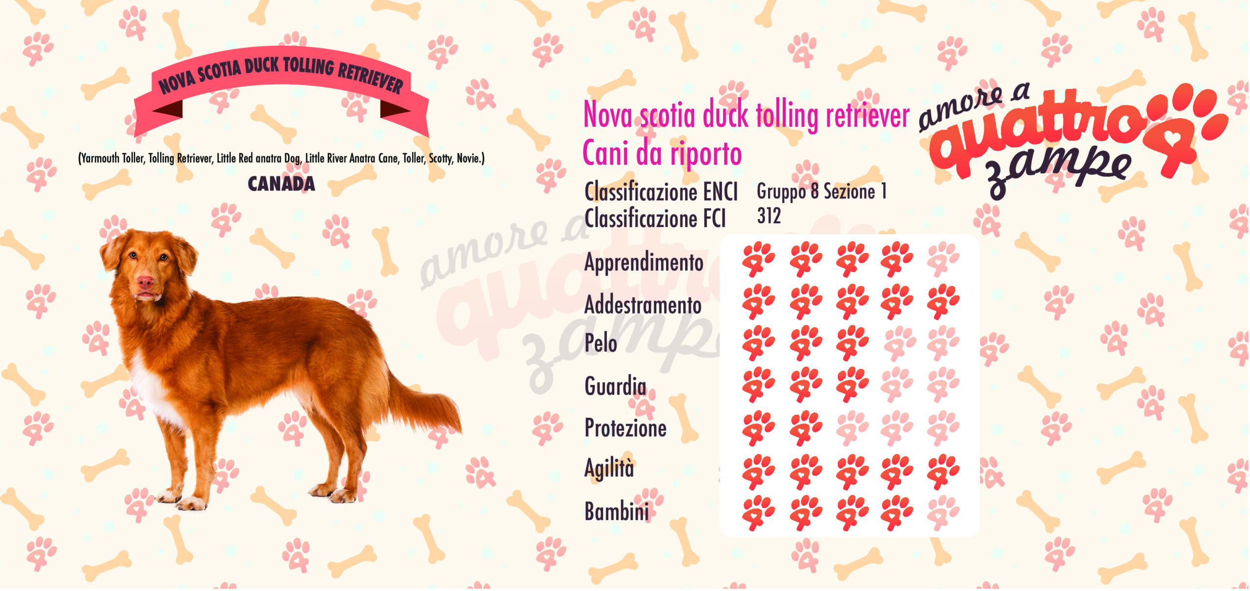 Il nova scotia duck tolling retriever è di medie dimensioni con un colore rosso per il suo manto. È un perfetto cane per tutta la famiglia. Ama giocare con i membri della sua famiglia e con i bambini soprattutto in attività di riporto. Sfoga tutta la sua energia in acqua e all’aperto, in casa sa essere calmo e tranquillo. Il Tolling Retriever ha il compito di correre sulla riva di un ruscello per attirare le anatre o uccelli acquatici e farli avvicinare al bordo. Una volta abbastanza vicini, il cacciatore può colpirli. Non si consiglia per gli anziani ma può essere acquistato dai novizi. E’ facile da addestrare poiché vuole compiacere il padrone.
