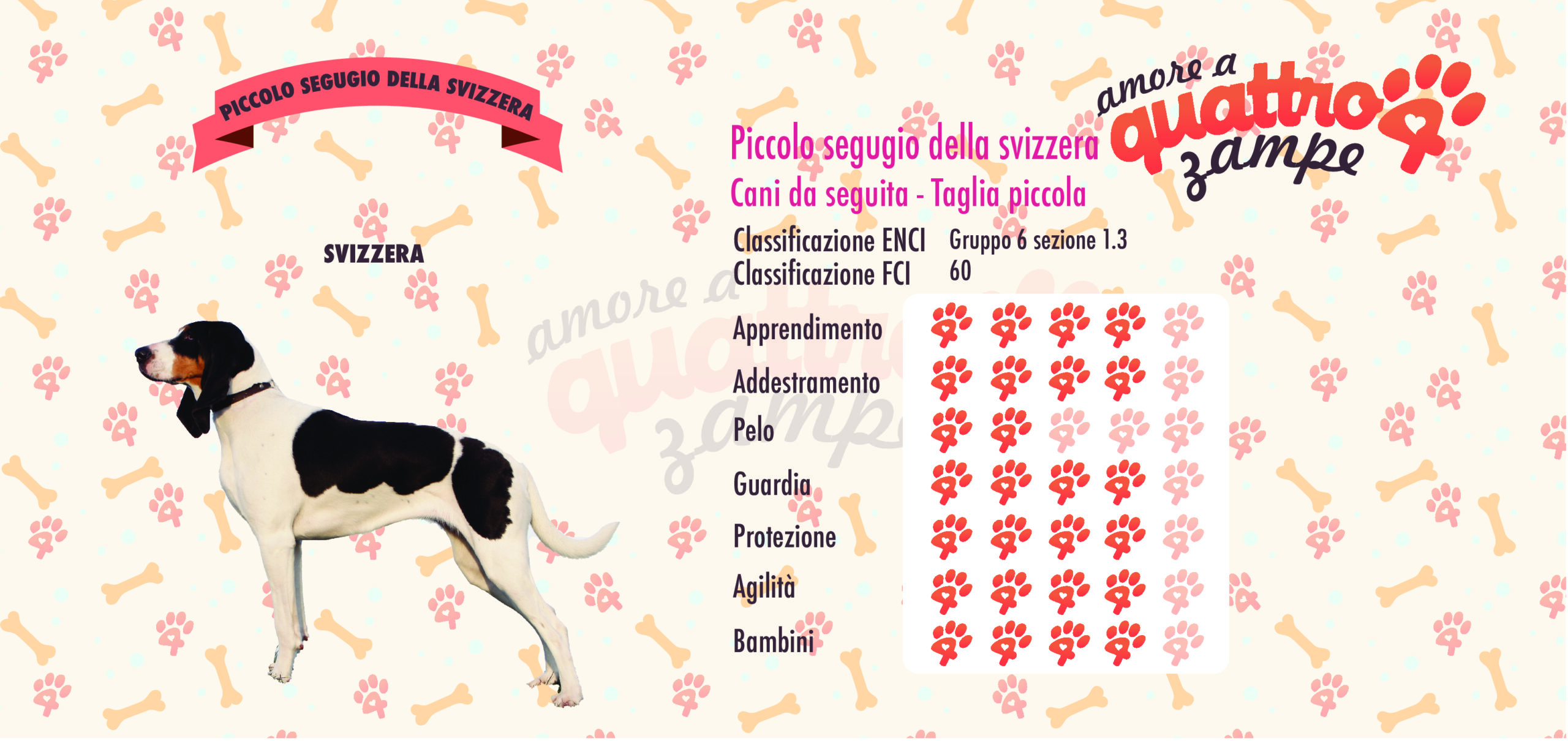 Il Piccolo segugio della Svizzera oppure chiamato Petit courant schwytzois è un cane eccezionale nel suo lavoro da cacciatore, riesce ad adeguarsi a qualunque tipo di terreno e qualsiasi specie di preda. È capace di cacciare anche da solo, ma ha bisogno anche di stare a contatto con altri che siano i suoi simili o persone umane. Il suo olfatto è fenomenale, tanto fine da essere capace nel seguire le piste di sangue. La sua tonalità di voce è così armoniosa da allerta in fretta il proprietario. Risulta agile, scattante e resistente. Nella vita quotidiana in casa, da non lavoratore, risulta tranquillo, sereno e mai aggressivo. Non ha paura dei pericoli, ma essendo socievole con le persone non è adatto per fare la guardia, tanto da non essere diffidente con gli estranei. Un cane per tutta la famiglia, da compagnia per gli adulti e da baby-sitter per i più piccoli. Quando sta con il padrone adora fare giochi che stimolano l’olfatto e la ricerca. Si adegua in qualsiasi luogo, ma stare in un piccolo appartamento non è la miglior soluzione, si consiglia di farlo stare in campagna o in una casa con giardino dove può sfogare la sua energia e correre in ampi spazi. Attenzione al suo istinto, può inseguire una pista se ne sente l’esigenza e questo lo porta ad allontanarsi da casa con molta facilità, infatti è indicato recintare il perimetro in cui vive per evitare la fuga. I cambiamenti climatici sono un problema poiché in estate deve poter fare meno attività fisica per il troppo caldo. La soluzione è quella di farlo camminare nelle prime ore del mattino o in tarda serata. In inverno riesce a vivere all’esterno ma deve poter avere una cuccia in cui ripararsi dalle intemperie. Essendo un cacciatore nato, vede qualsiasi cosa come una preda, ma i felini che sono stati con lui fin dalla nascita possono vivere al suo fianco senza nessun pericolo. Visto che lavora anche altri cani può coabitare con i suoi simili senza avere grosse difficoltà.