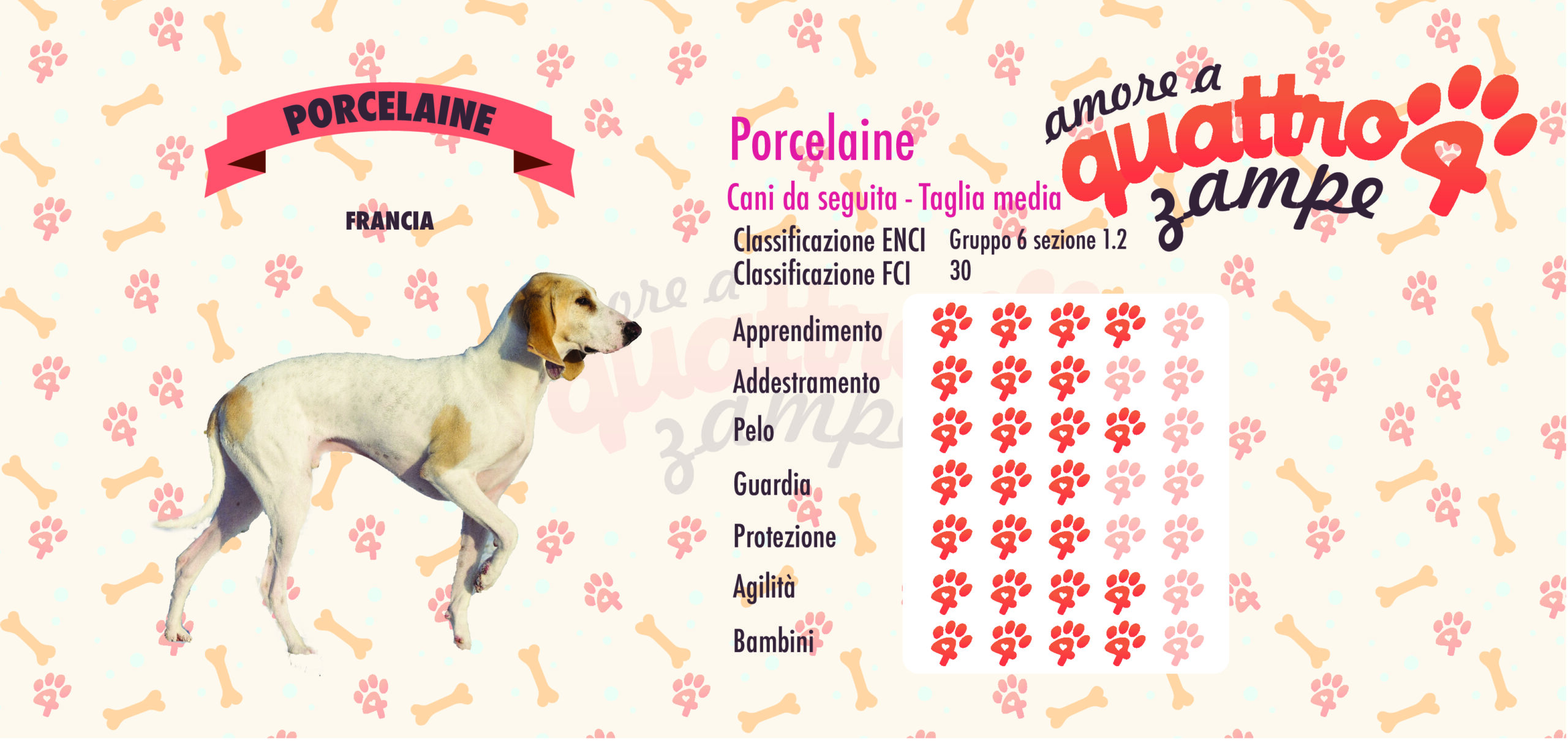 Il Porcelaine è un segugio da cerca, ma sa essere anche un cane da compagnia però attenzione a non adottarlo esclusivamente solo per farlo stare in casa. Adorato dai cacciatori per la sua indipendenza sul lavoro e dà ottimi risultati con qualsiasi tipo di animale selvatico. Giocherellone con i bambini ma non tanto affettuosa. Attenzione ai giochi che svolge con i bambini, perché deve poter non sviluppare l’istinto di inseguire, in quanto troppo sviluppato, quindi si devono evitare i giochi di lancio. È una razza molto conosciuta ma poco diffusa. Questo cane ha bisogno di attività fisica e un padrone attivo. Gli anziani e i sedentari non sono la miglior soluzione. In casa è calmo a lavoro esprime tutta la sua energia. Non troppo diffidente con gli estranei ma sa essere aggressivo se si sente minacciato. Non è ideale per la guardia però sa allertare il padrone. Riesce ad adattarsi in qualunque luogo dalla città alla campagna. Rispecchia a pieno la Francia nella sua struttura elegante e il suo portamento fiero.