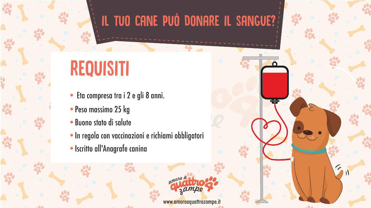 La donazione è completamente sicura ed indolore, e si può ripetere ogni 3 mesi. I requisiti sono di età (compresa tra i 2 e gli 8 anni), di peso (massimo 25 kg), essere in regola con le vaccinazioni obbligatorie e i relativi richiami, oltre ovviamente alla registrazione all’anagrafe canina e uno stato di buona salute. In caso di necessità, un cane donatore può ricevere una trasfusione e un consulto gratuitamente.