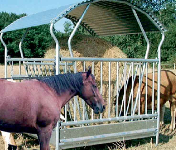 Si tratta di strutture per i cavalli che sono al prato dove viene inserita la balla. In questo modo, il cavallo ha sempre a disposizione il fieno, mangia quando vuole e si regola da solo.
