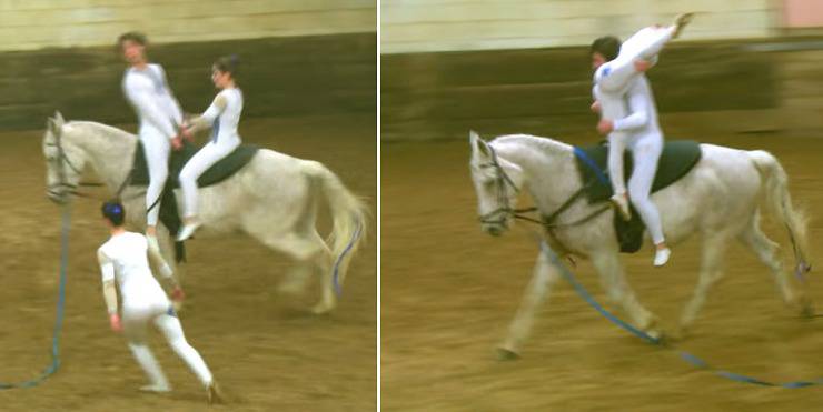 Acrobazie al cavallo che uniscono l’agilità del cavaliere abbinata all’arte del movimento del cavallo.
