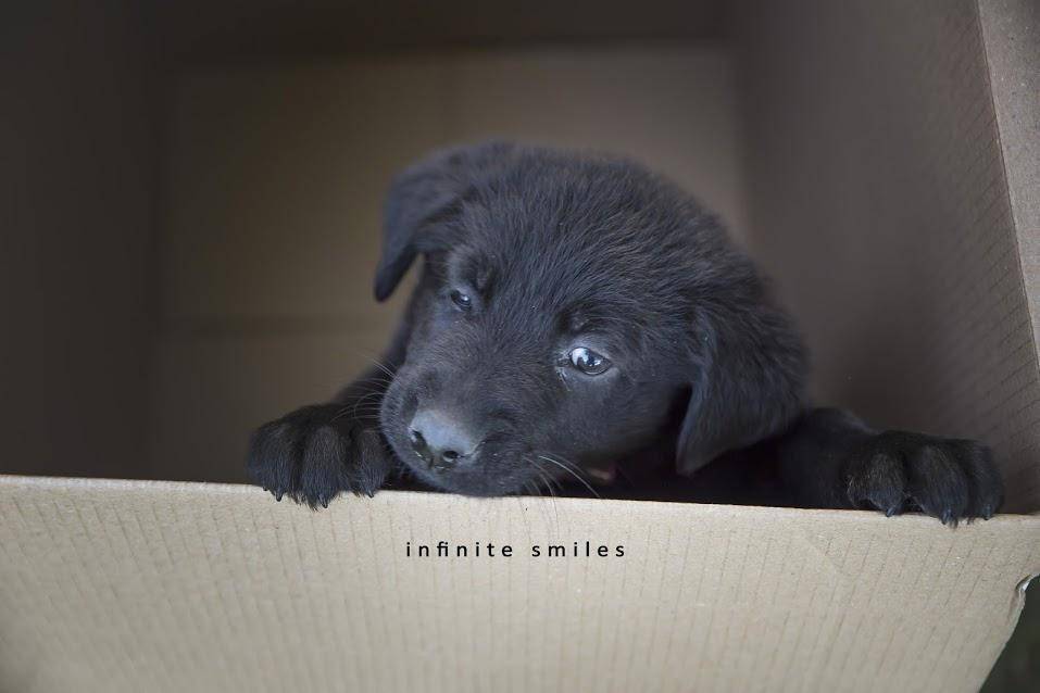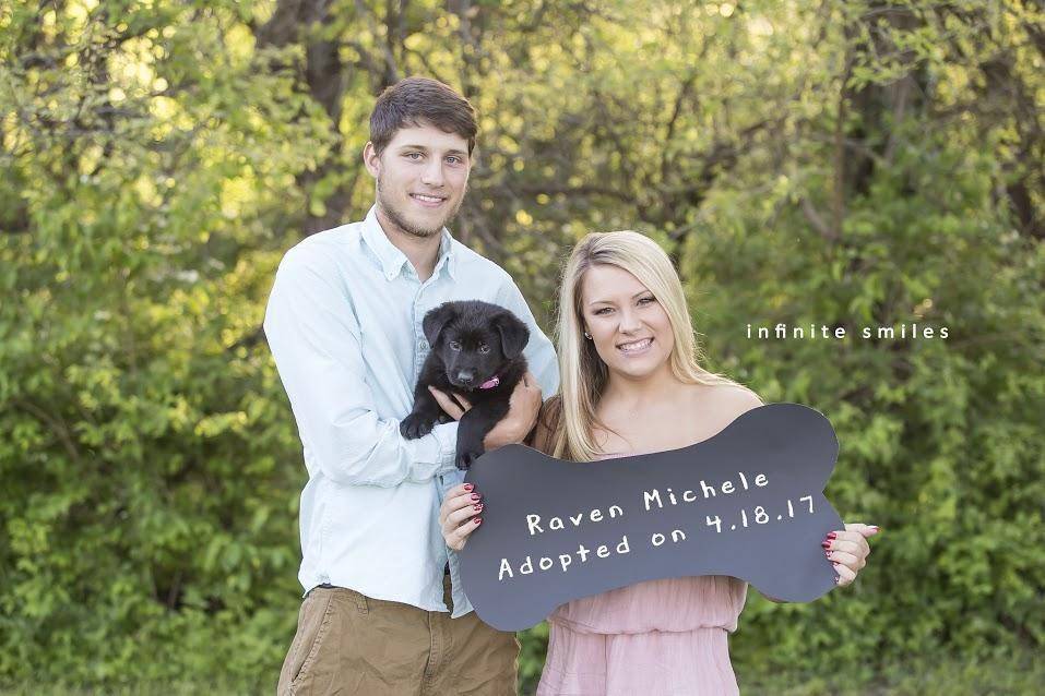 A quel punto, il cucciolo sbuca dalla scatola reggendosi sui suoi posteriore e Kennedy e Jake prendono un cartello sul quale c’è scritto il nome del cucciolo “Raven Michel, adottato il 18 aprile 2017”.