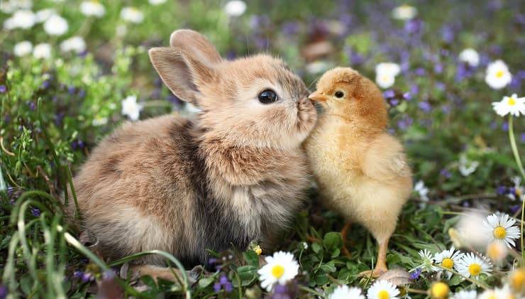 Un coniglio e un pulcino dimostrano di volersi bene con questo super kiss.