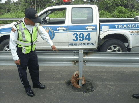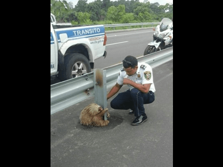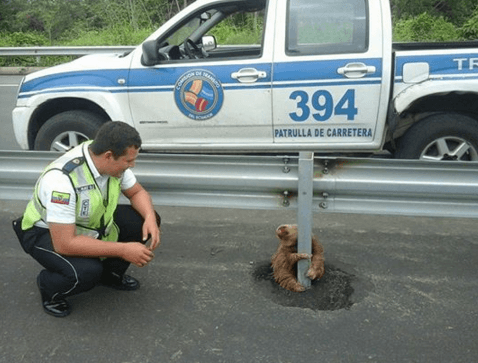 Una fotografia meravigliosa che sta facendo il giro del mondo dopo essere stata condivisa sul profilo Facebook della Comisione de Transito del Ecuadore (Polizia stradale). Si tratta di un dolcissimo esemplare di Folivori (Sloth), un bradipo che ha cercato di attraversare una strada e che, spaventato, si è aggrappato nell’unico punto che poteva sembrare un albero: il paletto di un guard rail.