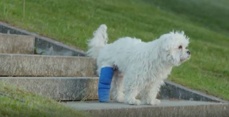 Nel filmato si vede un ragazzo che porta a passeggio un cagnolino bianco, quest’ultimo ha una vistosa steccatura blu che gli impedisce di correre e anche di camminare velocemente.